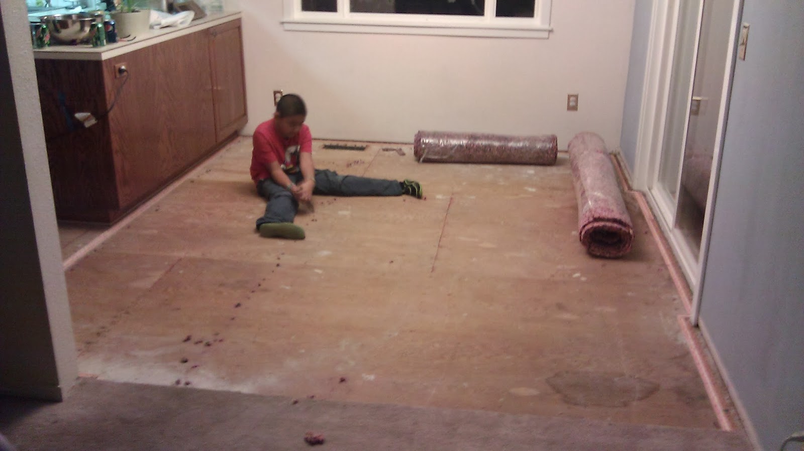 I enlisted the aid of Liam to pull out the last 200 staples, carpet tacks and tack strips in the sub-floor where the carpet pad had been. He did a great job, and can verify that 200 staples was not an exaggeration.